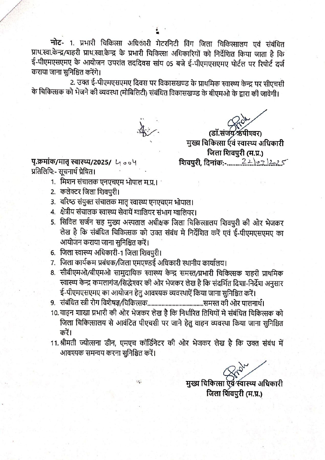 शिवपुरी। प्रधानमंत्री सुरक्षित मातृत्व अभियान के तहत जिला अस्पताल, सीएचसी और पीएचसी पर कल 25 मार्च 2025 को सुबह 9 बजे से 5 बजे तक स्वास्थ्य शिविर आयोजित किए जाएंगे। CMHO डॉ संजय ऋषिश्वर ने जिले के लोगों से लाभ उठाने की अपील की है।